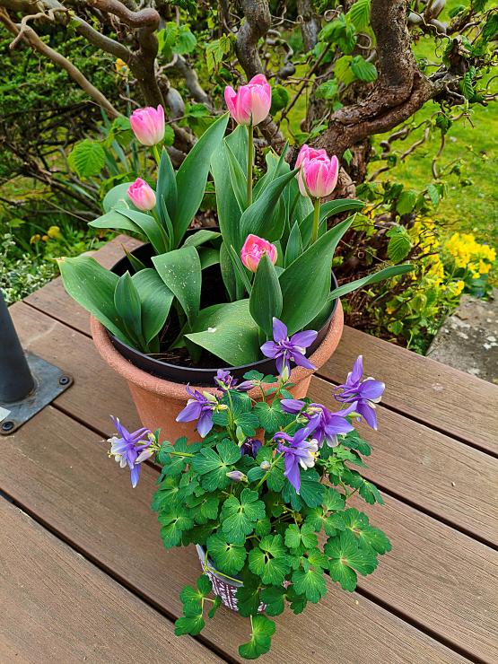 Die Tulpen im Topf sind natürlich nicht neu, nur die Akelei. Ich habe im Garten schon eine Menge blassrosa Akeleien, die sich wild eingefunden haben. Jetzt wollte ich dann doch mal eine kräftigere Farbe und hoffe, dass diese sich dann auch versamt. Was ich mit den anderen Pflanzen so vor – und auch schon angefangen – habe, gibt es dann beim nächsten Mal. Am Fuß des Teichs gestalte ich ein sehr vernachlässigtes Beet neu, unter anderem mit einer kleinen Kräuterspirale. Die Basis dafür hat mich gerade mal 4,99 Euro gekostet.