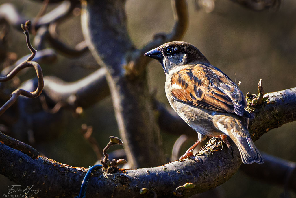 Ach ja – die Spatzen! Sie sind wieder da *freu*. Erst habe ich in den letzten Tagen nur ihr Tschilpen gehört und plötzlich saßen sie in der Korkenzieherhasel. Angelockt von den Meisenknödeln, nehme ich an.