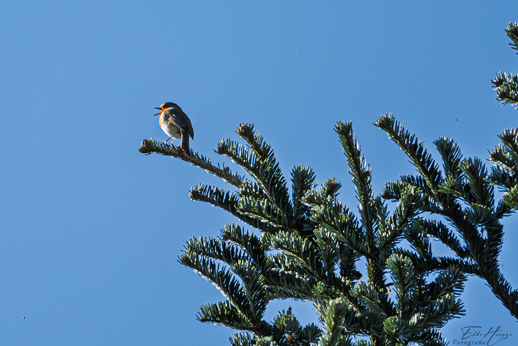 Im Garten geht es ruhiger zu. Nur die Rotkehlchen sind jetzt voll auf Speed. Die schmettern, was das Zeug hält, und immer von der höchsten Warte aus. Also von ganz oben auf der Tanne.