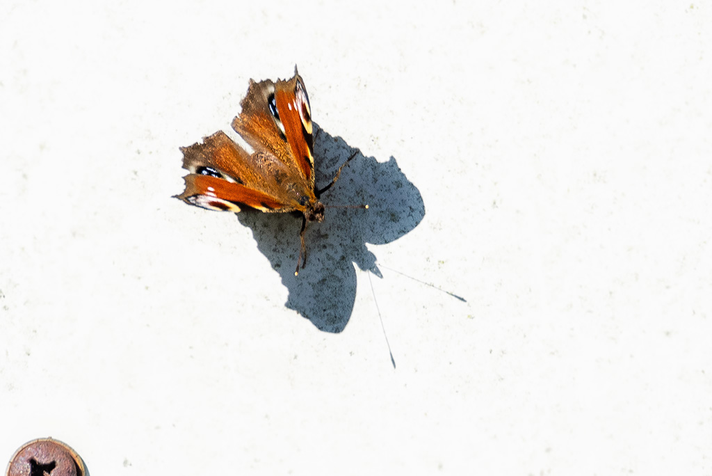 Ein ziemlich zerrupftes Tagpfauenauge saß auf der SAT-Schüssel. Das ist zwar über den Winter gekommen, aber mir scheint, seine Aussichten sind nicht die besten.