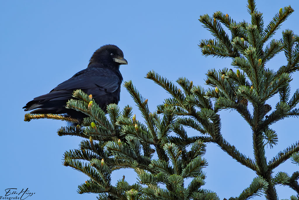 Auch bei dieser Rabenkrähe habe ich mich gefragt, ob es schon ein Jungvogel sein kann. Der Schnabel ist relativ hell, aber eine Saatkrähe ist das nicht. Im Vergleich zu unserem stationären Rabenkrähenpaar kommt mir dieser Vogel eher klein und kompakt vor. Aber anders als bei den Meisen dauert es von der Eiablage bis zum flügge werden anderthalb bis zwei Monate. Kann also kaum sein. Vielleicht einer vom letzten Jahr? Im Garten ist es doch immer wieder interessant und spannend.