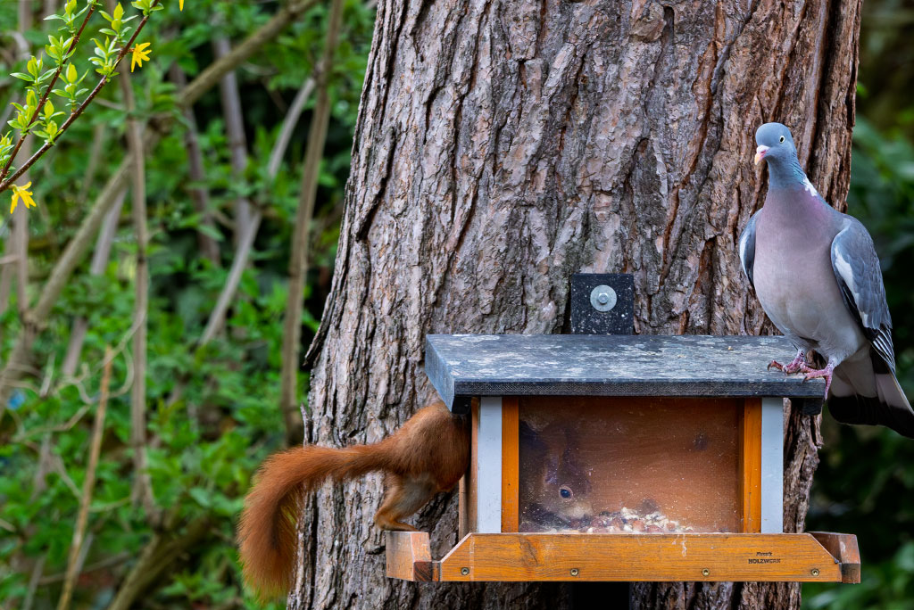 Im Garten ärgere ich mich seit einiger Zeit über die Ringeltauben, die neuerdings glauben, das Eichhörnchenfutterhaus sei für sie gemacht. Sie kommen zwar nicht wirklich durch die Löcher ins Innere, versuchen es aber und können immer mal wieder ein paar Körner oder Nüsse ergattern, die nicht direkt in der Mitte liegen. Aber sie sind so aufdringlich geworden, dass sie ab und an die jungen Eichhörnchen vertreiben.