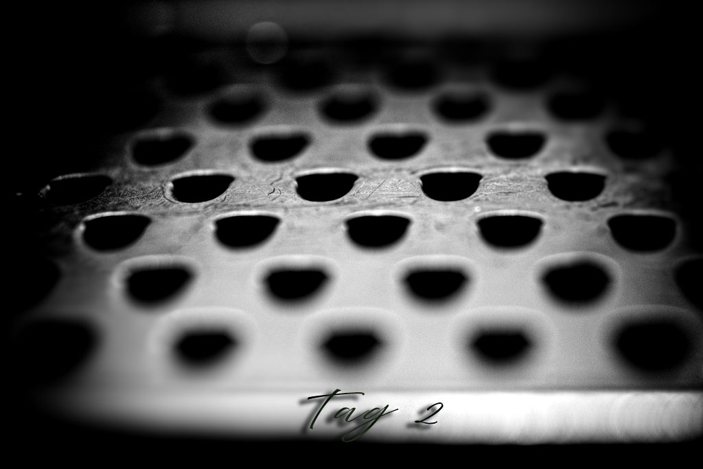 Dieses Mal habe ich mit mehr variabler Beleuchtung, aber sonst bei völliger Dunkelheit experimentiert. Die Reibe stand auf dem schwarzen Cerankochfeld. Ich habe mal ein LED-Licht darunter gelegt, mal obendrauf. Dann hatte ich noch einen kleinen LED-Würfel zur Verfügung und meinen neuen Godox iT32-Blitz, den ich auch von der Kamera abnehmen kann, um damit von irgendeiner Seite zu blitzen. Die meisten Ergebnisse waren eher zu hell und ich habe in der Nachbearbeitung wieder abgedunkelt. Aber zufrieden bin ich auch heute nicht.
