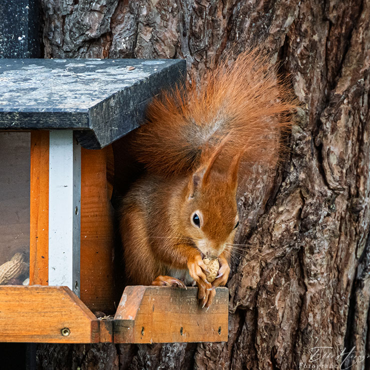Zum Schluss noch ein Eichhörnchen. Es scheint im Moment immer dasselbe Männchen zu sein, das sich am Futterhaus blicken lässt.