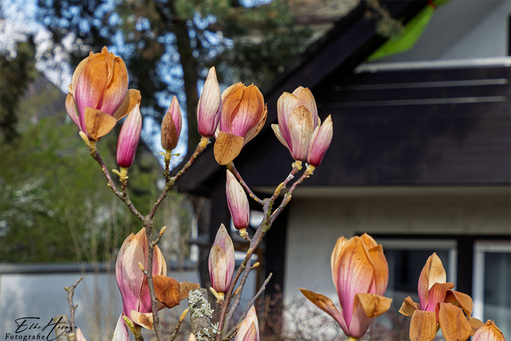 Leicht frustriert war ich schon am Morgen, weil der Nachtfrost nun doch die schönen Magnolienblüten braun gefärbt hat. Es ist auch tagsüber ziemlich kalt, außer direkt in der Sonne, wenn sie denn scheint. Trotzdem blüht es im Garten munter weiter und auch Bäume und Sträucher bekommen schon das erste Grün. Die Kupferfelsenbirne steht kurz vor der Blüte (Headerbild). Die konnte ich sogar mit Mond ablichten.