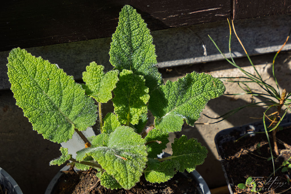 Zumindest einer meiner im Hochbeet überwinterten kleinen Muskatellersalbeipflanzen macht sich gut. Der bekommt erstmal einen größeren Topf. Nach den bisherigen Erfahrungen kommt er mir so schnell nicht ins Beet und dann nur mit Schneckenschutz. Ein zweiter sieht zurzeit noch eher mickrig aus. Die waren auch im Winter im Hochbeet wieder angefressen worden! Aber ich hoffe, dass der es auch noch schafft.