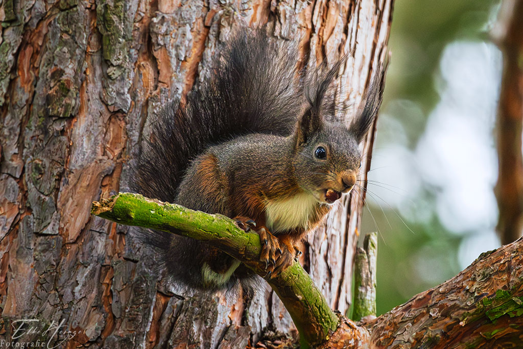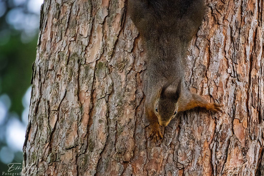 Dann also Eichhörnchen. Manchmal habe ich den Eindruck, dass die Hörnchen bei schlechtem Wetter aktiver sind als bei Sonne. Aber vielleicht schlafen sie so wie ich nur länger. Und damit sind wir kompatibler ;-). An der Kiefer ging es jedenfalls rund. Rote und Dunkle waren gleichermaßen unterwegs und haben sich teilweise rauf und runter um den Stamm gejagt.