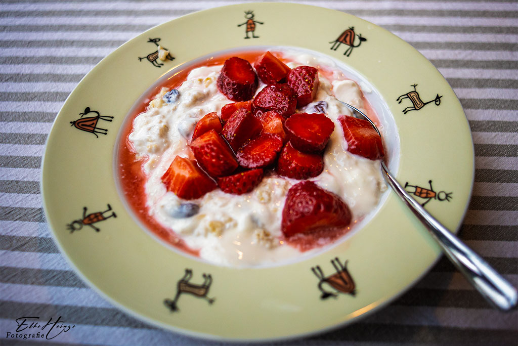 Wie vorhergesagt, regnet es heute tatsächlich etwas und ist entsprechend kühler. Morgen soll es aber schon wieder besser werden. Mein Tag fing wie üblich mit Porridge an, und zwar mit den ersten Erdbeeren. Ich habe mich wider bessere Erfahrungen von der Farbe verleiten lassen. Natürlich haben sie kein Aroma. Aber mit Porridge zusammen kann man sie essen. Jetzt warte ich aber lieber auf unsere guten heimischen Erdbeeren von den Krifteler Feldern.