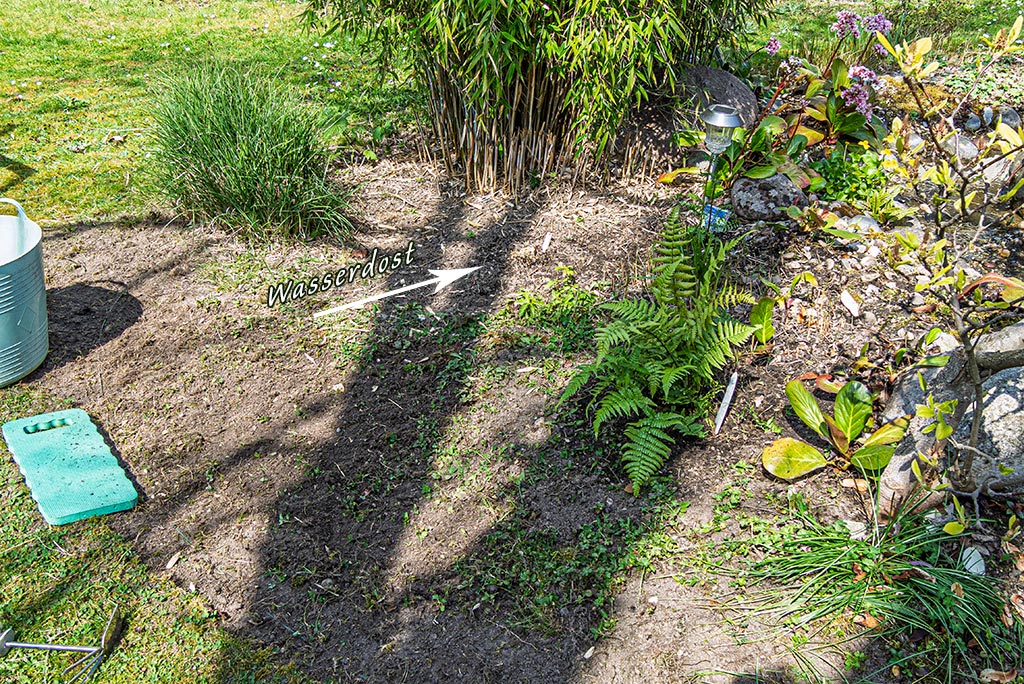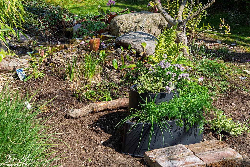 Ich habe mir von Ald* für unter fünf Euro (unfassbar!) eine kleine Kräuterspirale aus Kunststoff mitgebracht. Das ist natürlich nur so ein gepresstes, nicht sehr hochwertiges Teil, aber ich dachte mir, da lässt sich etwas draus machen. Meine Küchenkräuter sind bislang überall im Garten verteilt. Das ist zwar nett, aber nicht unbedingt praktisch. Leider gibt es direkt in Küchennähe keinen Platz mehr, also habe ich mir nach einigem Überlegen das untere Ende unseres Teichs ausgeguckt. Das Beet dort war schon lange keins mehr. Zwischen Bambus und Magnolie wuchs fast nur noch Unkraut (wirklich Unkraut), Reste vom Japanischem Blutgras und Astilben mickerten eher so vor sich hin. Seit Donnerstag habe ich also gerupft, gegraben, zurückgeschnitten (ein Ziergras vor dem Bambus geteilt) und den Boden verbessert. Die letzte Tat am Freitag war das Einpflanzen eines neuen Farns und des noch kaum sichtbaren Wasserdosts.