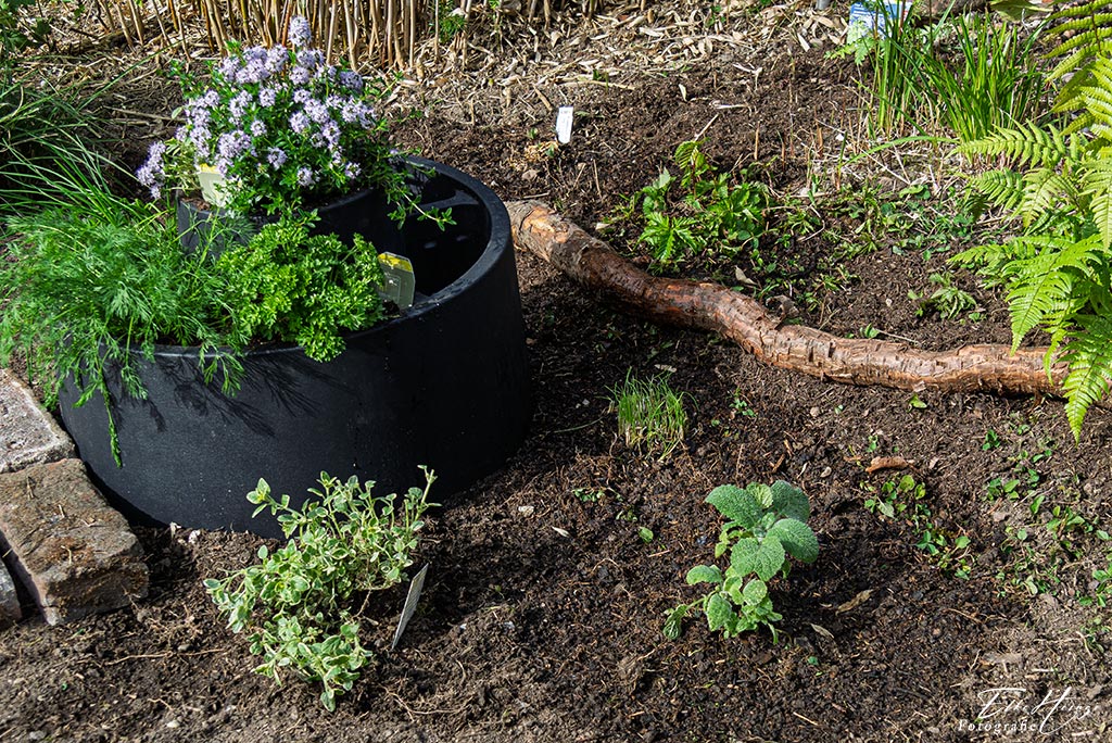 Neben der zweiten Oreganohälfte sitzt einer meiner Muskatellersalbeis und ein komplett zurückgeschnitter Schnittlauch aus der Küche, der gerade wieder austreibt. Den Teichrandbereich, in dem eher normale Pflanzen wachsen, habe ich dekorativ mit einer dicken Wurzel unserer Kiefer vom Kräuterbereich getrennt. Diese Wurzel hatte unsere Terrasse unterwandert und teilweise angehoben. Mein Mann hat sie mühsamst entfernt. Es ist unglaublich, welche Kräfte da am wirken sind. Zwei Vertiefungen der Spirale sind noch frei. Ich überlege noch, was da reinkommen soll.