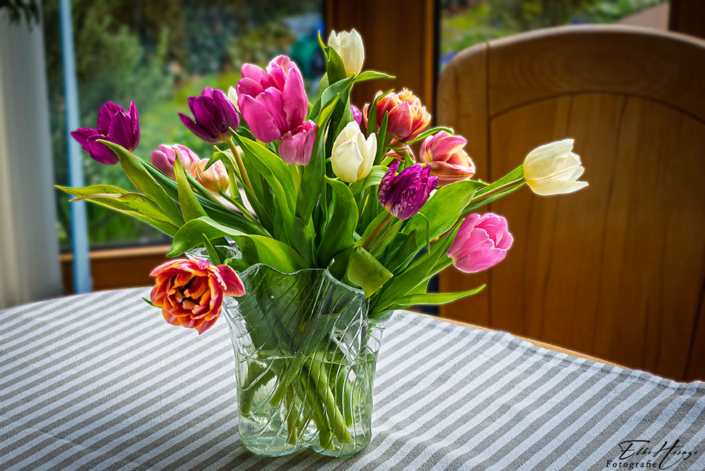 Es hätte schlimmer kommen können. Gestern Morgen habe ich erstmal unter dem Rollladen hindurchgelinst, ob da draußen eventuell Schnee liegen könnte. War aber nicht. Kalt ist es schon und hin und wieder tröpfelt es. Auch Graupel gab es schon, aber dann scheint auch wieder die Sonne. Meine Männer sind immer noch fleißig am Terrasse bauen. Denen wird es dabei immerhin warm. Ich habe mir für drinnen tatsächlich nochmal einen bunten Strauß Tulpen mitgebracht – meine Freitagsblümchen. Die Tulpen blühen zwar jetzt auch schon im Garten, aber davon habe ich gerade nicht so viel. Na ja, irgendwann wird die Terrasse fertig und das Wetter wieder besser.
