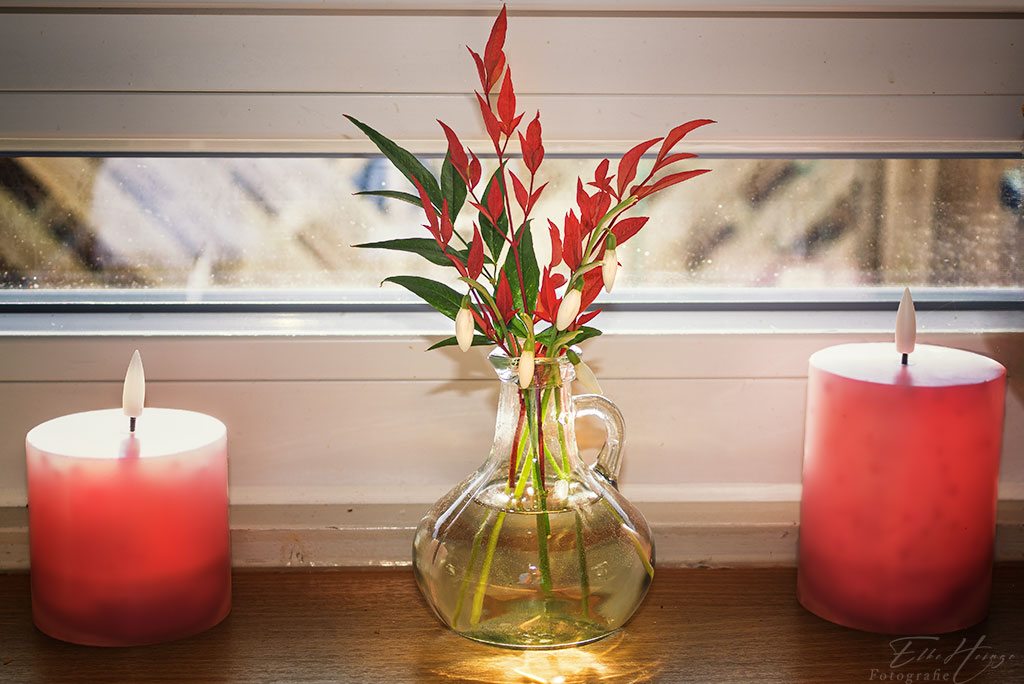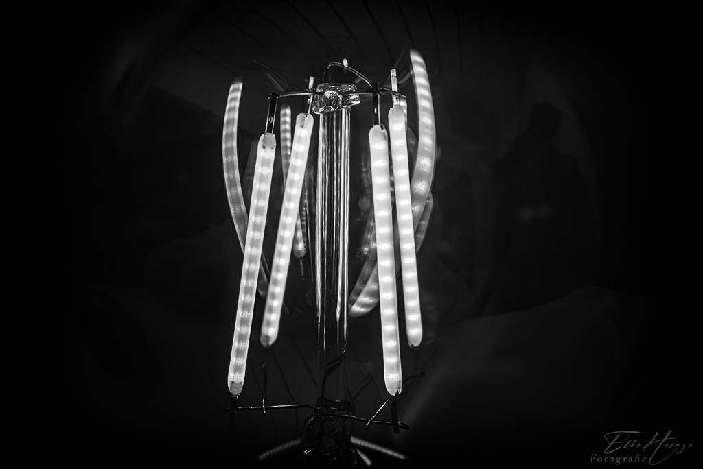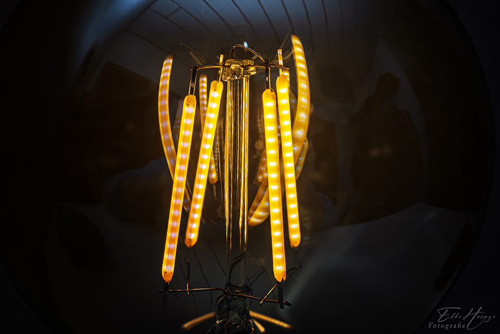 An meinem ersten Motiv bin ich gestern Abend wie so oft vorbeigelaufen und dachte plötzlich „das ist doch schon mal was“. Im Flur steht auf einer Kommode eine kleine Leuchte, die wie eine altmodische Glühbirne auf einem Sockel aussieht. Nachdem ich die weihnachtliche LED-Beleuchtung weggepackt habe, dient sie als so eine Art kleines Nachtlicht. Da die „Glühfäden“ (LEDs) leuchten, hielt sich der fotografische Aufwand in Grenzen. Ich habe nur zusätzlich einen Aufhellblitz eingesetzt, damit auch noch etwas vom weiteren Innenleben sichtbar blieb. Den Blitz habe ich an die weiße Decke gerichtet, um sie als Reflektor zu benutzen. So ganz zufrieden bin ich mit dem Ergebnis nicht. Die farbige Variante gefällt mir aber ganz gut.
