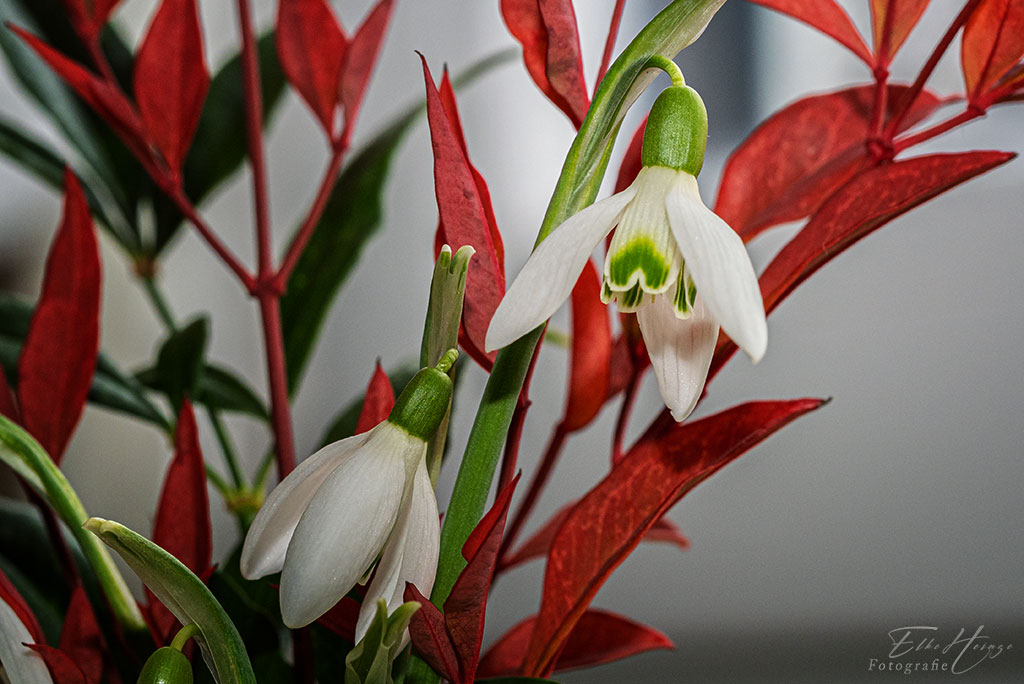 Heute haben wir schönstes Winterwetter – kalt bis frostig, noch Schnee, aber Sonne und blauer Himmel! Entschieden schöner als gestern. Die Krokusse und Schneeglöckchen schieben sich weiterhin unbeirrt durch den Schnee. Ein paar Schneeglöckchen habe ich mir mit einigen Zweigen des großen Himmelsbambus‘ in eine kleine Vase gestellt.