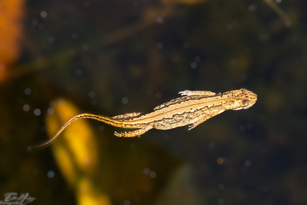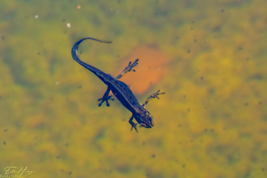 Na, was ist das denn? Ich gebe zu, ich stehe hier auch öfter und halte vergeblich nach Eidechsen Ausschau. Irgendwer war wohl der Meinung, zumindest irgendeine Echse sollte doch zu sehen sein. Aber ich habe auch noch richtige anzubieten. Doch zunächst geht es noch zum Teich. Da gab es Molche in allen Größen, helle und dunkle. Egal welche Färbung, es dürften alles Teichmolche (Lissotriton vulgaris) sein.
