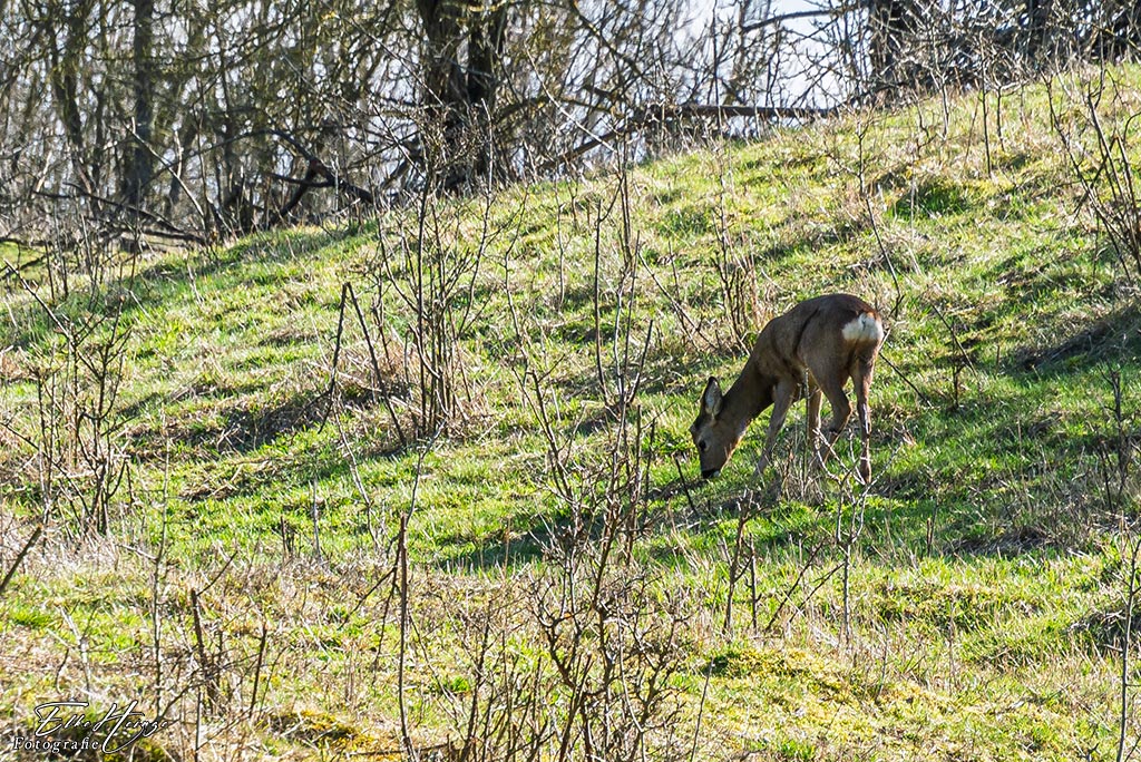 Auf dem Rückweg habe ich auf dem nicht zugänglichen Hügel, auf dem manchmal Schafe weiden, doch tatsächlich ein Reh gesehen. Ein bisschen weit weg, aber immerhin. Dass es hier Rehe gibt, ist mir nicht völlig neu. Vor ein paar Jahre hatte ich schon einmal eine Begegnung. Aber das war in der Nähe vom „Haus des Dichters“, also an einer völlig anderen Stelle.