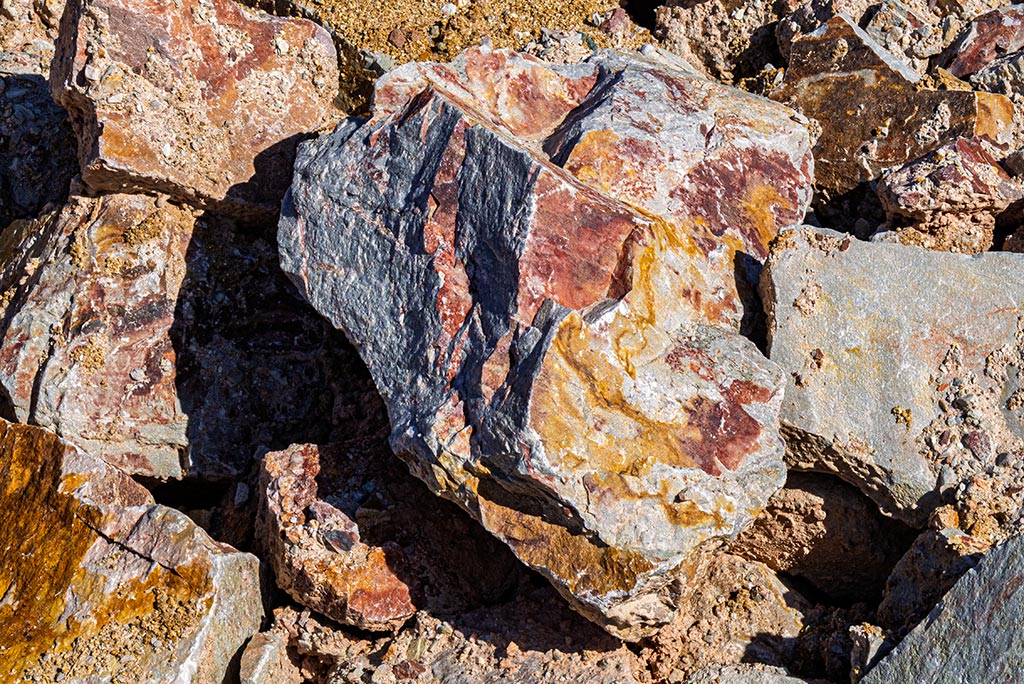 Im noch aktiven Kiesabbaugebiet (nicht zugänglich) sieht es jedes Mal anders aus. Mal ist ein neuer See entstanden, mal neue Hügel. Heute gab es außerhalb auch eine Menge Aushub mit großen Steinen, die zum Teil interessante Farben hatten.