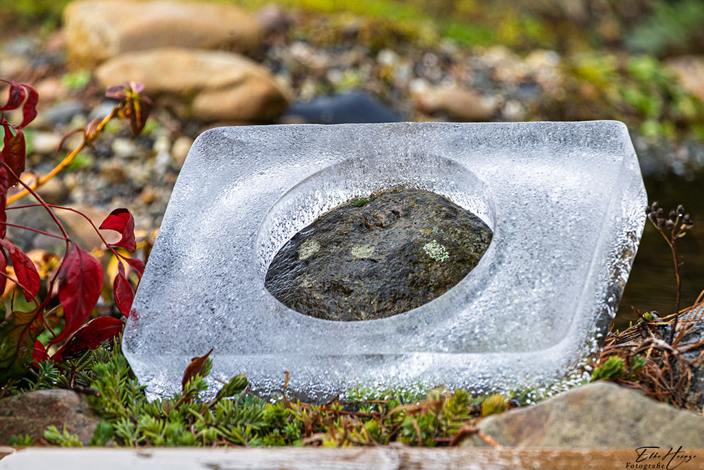 Inzwischen ist es um einiges milder als die letzten Tage, der Schnee ist weg. Stattdessen regnet es. Im Headerbild seht ihr das, was die Kälte aus meiner improvisierten Vogeltränke gemacht hat.