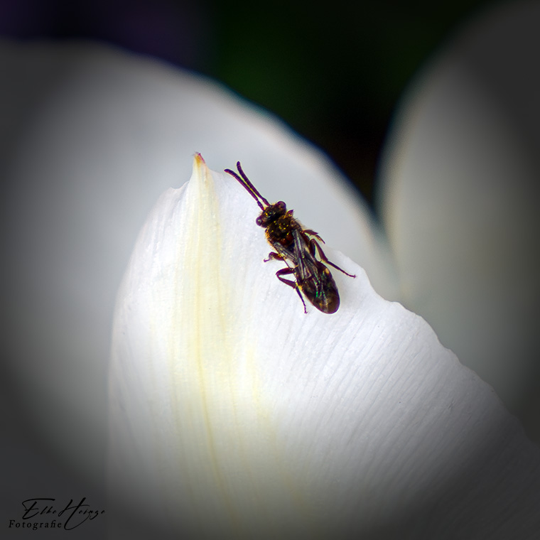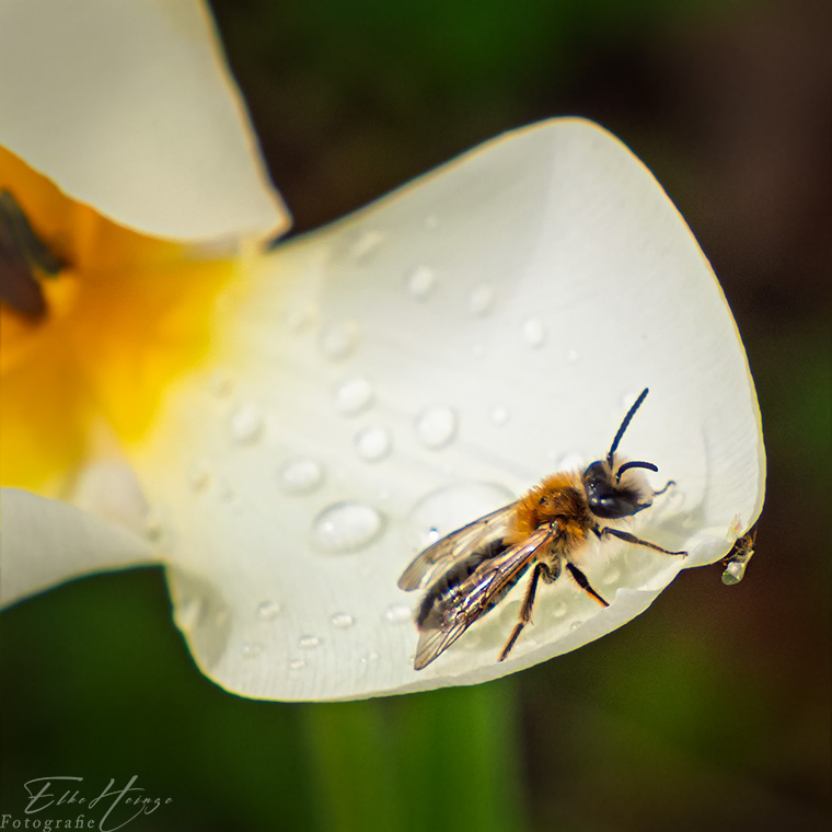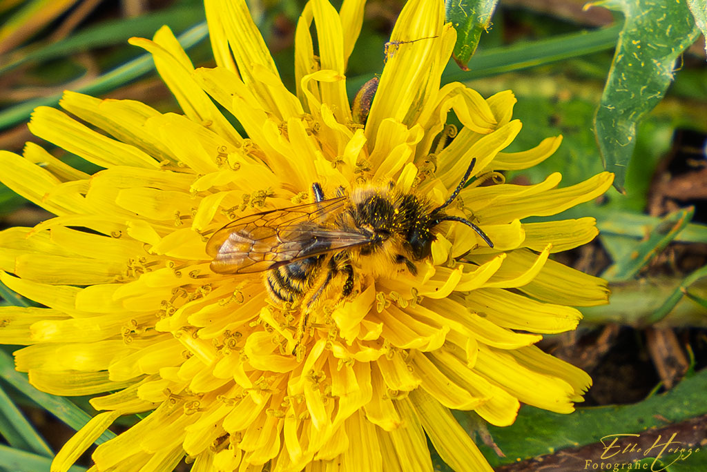 Ich gehe mal davon aus, dass es eine Frühlings-Seidenbiene ist. Der rot-braune pelzige Rumpf spricht dafür. Am Rand des Blütenblatts krabbelt noch ein nicht weiter bestimmbarer Winzling ***. Und auch auf der Löwenzahnblüte saß eine kleine Biene, ähnlich groß wie die Frühlings-Seidenbiene, aber heller und am Hinterleib haariger. Vielleicht gibt es da auch Farbvariationen. Eins weiß ich mit Bestimmtheit, eine Expertin in der Bestimmung von Insekten werde ich nie.