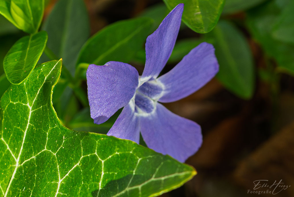 Vinca major besitzt große, eiförmige bis herzförmige Blätter, oft mit feinen Härchen am Rand. Vinca minor hat kleine, schmale, lanzettliche Blätter, die unbehaart sind. Dann müsste das doch das Große Immergrün sein. Vorn ist natürlich ein Efeublatt.