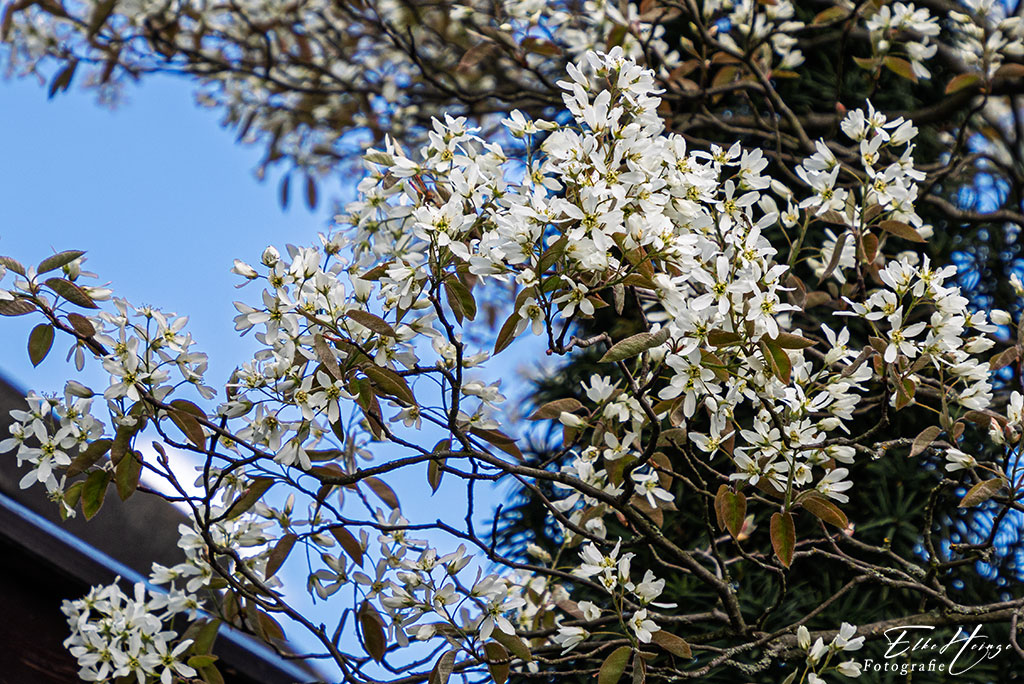 Die Kupferfelsenbirne blüht und die Chinesische Strauchpäonie hat schon ganz dicke Knospen. Das freut mich ganz besonders, weil sie Ende 2024 total krank aussah und ich sie bodennah zurückgeschnitten hatte. Dadurch hatte sie im letzten Jahr natürlich gar keine Blüten. Das Laub und die Knospen sehen schon schön aus.