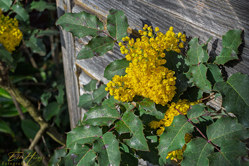 Und noch einmal Gelb. Die Mahonie ist ein Neophyt und heftigst invasiv, jedenfalls bei uns im Garten. Aber ich mag sie trotzdem. Und sie ist ein wichtiges Insektennährgehölz im Frühling und im Herbst mit ihren blauen Beeren ein Vogelnährgehölz. Aber ich muss sie wirklich in Schach halten.