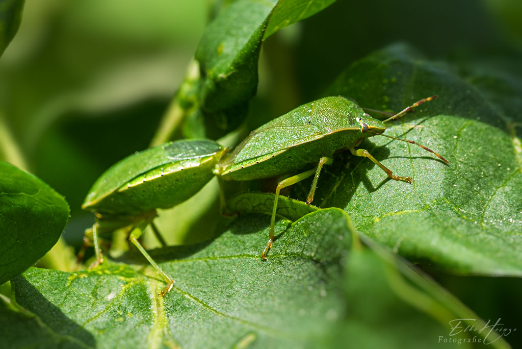 Die Grünen Reiswanzen sorgen auch schon wieder für Nachwuchs. Das war ein Zufallsfund. Auf den Fliederblättern sind sie kaum zu erkennen. Das nenne ich mal eine Tarnfarbe vom Feinsten.