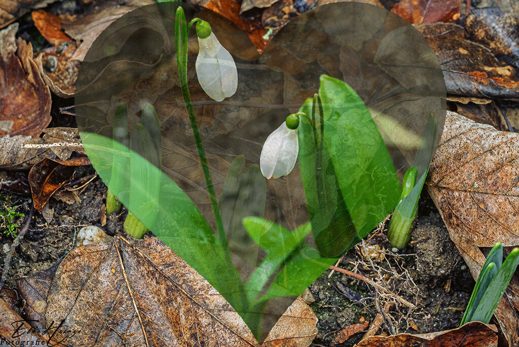 JuttaK. hat ein altes Projekt reaktiviert, den Digital Art Dienstag. Ich bin zwar nicht der ganz große Fan dieser Spielereien, aber heute habe ich einfach mal mitgemacht. Aus dem letzten Bild mit dem alten Laub und dem Schneeglöckchenfoto ist das hier entstanden: