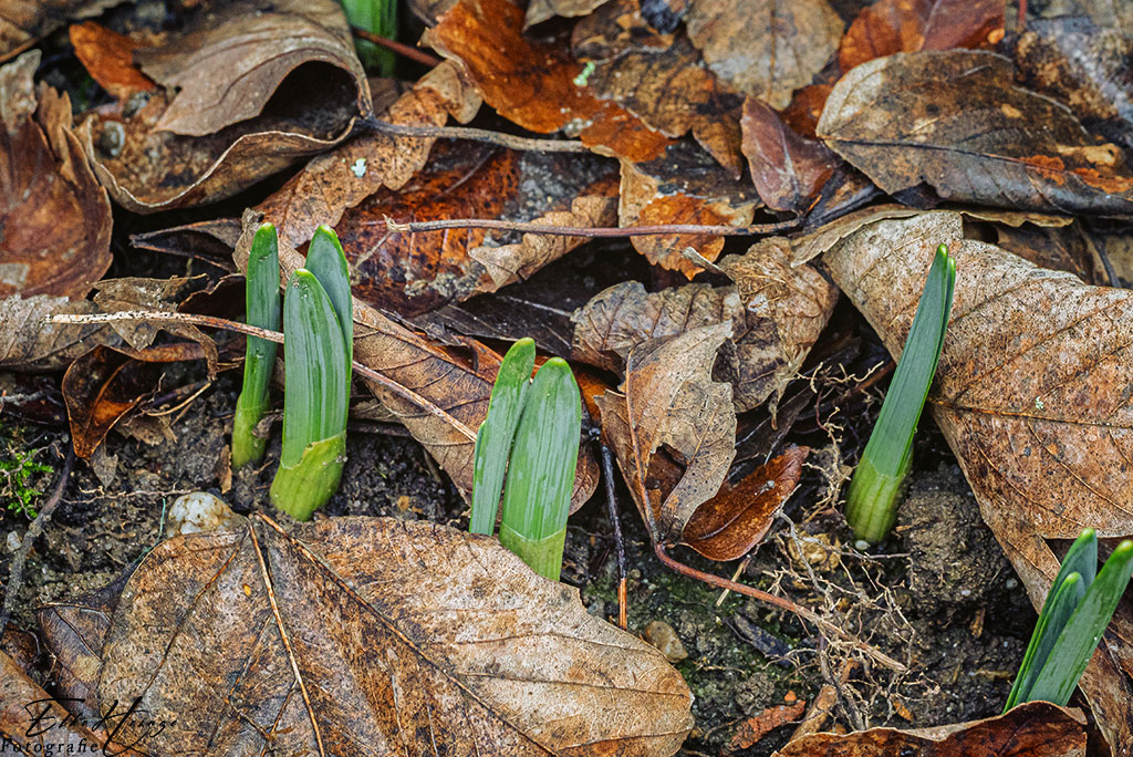Überall in den Beeten schieben sich grüne Spitzen durch das Laub. Aber ohne Sonne und Wärme dauert es wohl noch eine Weile, bevor ich mehr zu sehen bekomme.